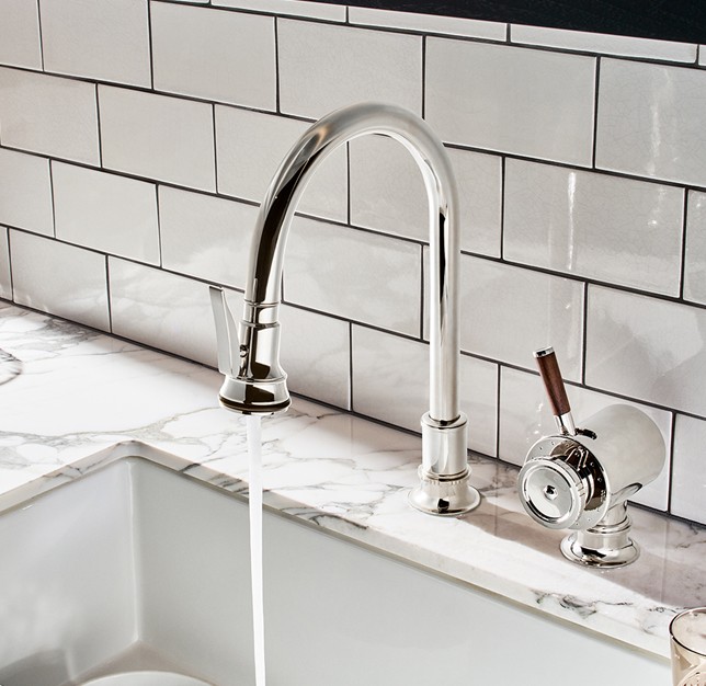 From left: bridge and gooseneck kitchen tap styles from TONI Copenhagen (Christiansborg), Newport Brass (Gavin), and Waterworks (Easton).