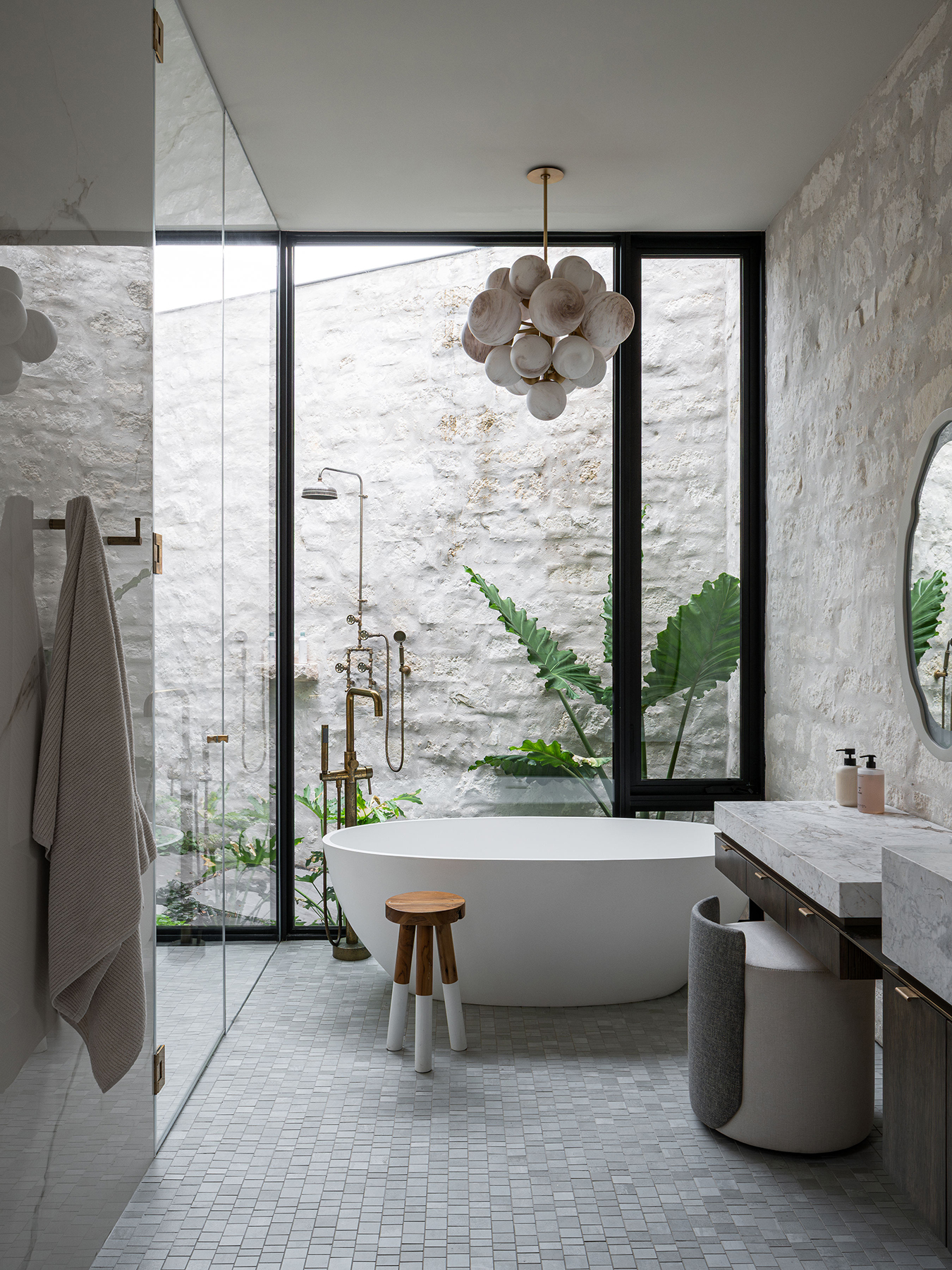 A longtime Alexander Marchant favorite, Classic Brass “Edge” pulls bring the bathroom cabinets to life in a way that’s both minimalist and chic. “I think Classic Brass has the best ‘Edge’ pulls out there, because they have so many finishes. But they can also do custom sizes and they have so many different styles — the most I’ve ever seen. If you don’t want the hardware to be the focal point, they give cabinets a clean, beautiful look.”